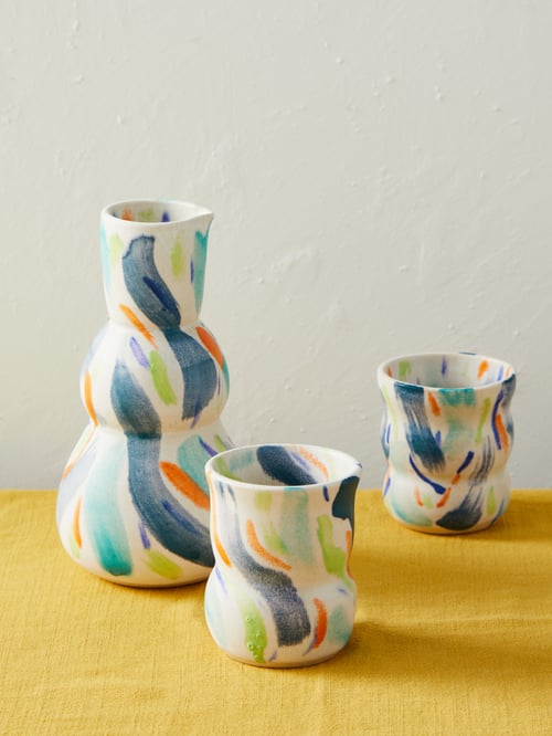 Statement carafe and tumbler set. Thrown in white stoneware, dipped in matt white glaze and finished with colourful brushstrokes.